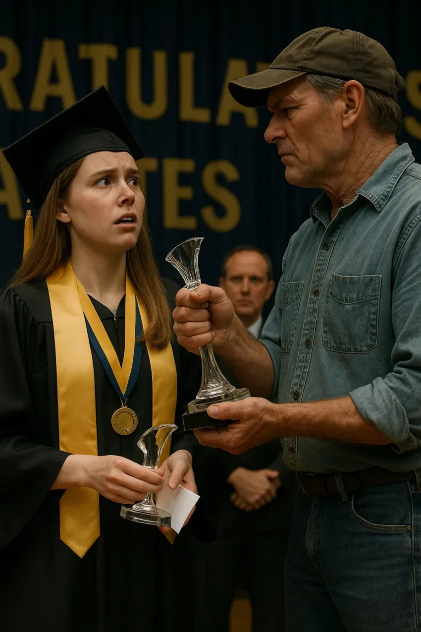 He mounted the stage like he had a right to, like this was his workshop and we were his apprentices. The principal stepped forward, uncertain. My father didn’t look at him. He looked at me—right through me, really—and at the trophy in my hands. For a moment, I believed he was going to lift my hand, raise it higher, say something that sounded like pride.