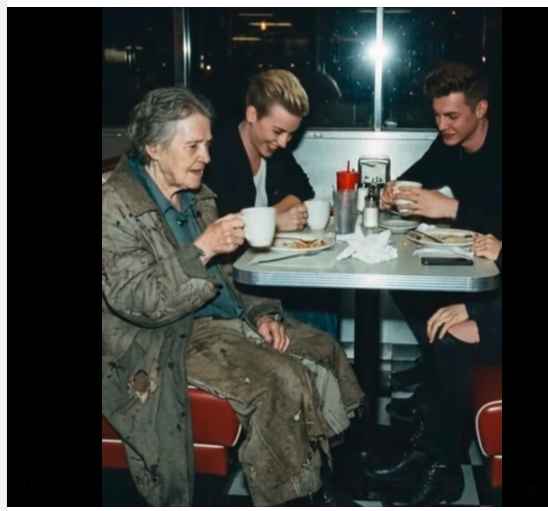 Humiliated, the old woman stood up slowly and whispered to the hostess, “It’s okay. I’ll go. I’ve got some change for a coffee at the gas station.”