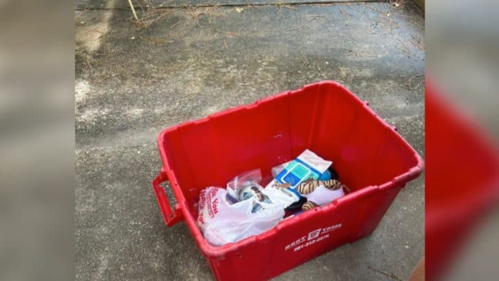 A few toys and a blanket had been tossed into the bin beside her, but it was clear she had been left there on purpose. Even worse, her paw was swollen and painful, proof that she was in need of medical care.
