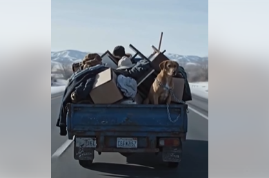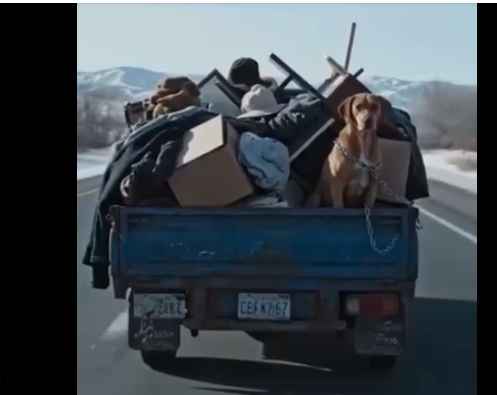 I was about fifteen minutes out of the city when I saw it. A rusty blue flatbed hauling what looked like junk—clothes, cracked dishes, wires, even a lamp missing its shade. But in the middle of all that… a dog.