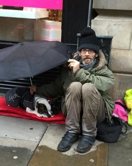 People walk by, some glance, some ignore us. A few drop coins, which I save for his food. He eats first. Always.
