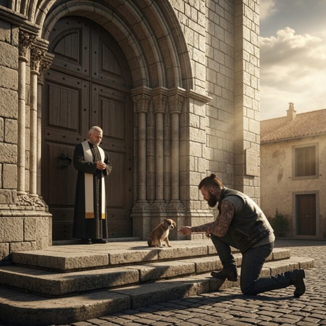 The puppy was thin, shivering, his fur matted with mud. Father Michael knelt slowly, speaking softly, “Where did you come from, little one?”