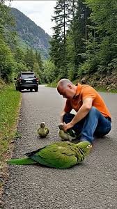 In a world often rushing by, sometimes a moment arises that compels us to pause. On a serene, tree-lined roadside, a quiet scene unfolded that served as one such profound interruption. There, amidst the gentle hum of nature, three small, vibrant green parrots found themselves in a precarious situation, their delicate lives seemingly at a crossroads.