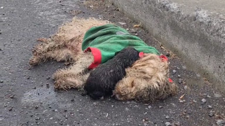 On the edge of a crowded highway, where the noise of engines drowns out almost everything, a heartbreaking sight quietly unfolds. A frail, dirt-covered dog lies motionless by the roadside, her tangled fur caked with mud and dust. Her body looks lifeless, still and defeated, as if the weight of suffering has finally silenced her. Next to her, pressed close for warmth and comfort, a single newborn puppy refuses to leave her side. Tiny and trembling, the little one seems unaware of danger—his only instinct is to stay near the mother who once kept him safe. It is a scene that captures both despair and devotion in their purest form.