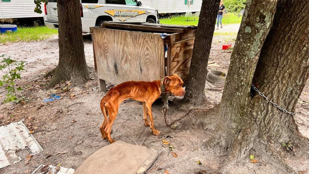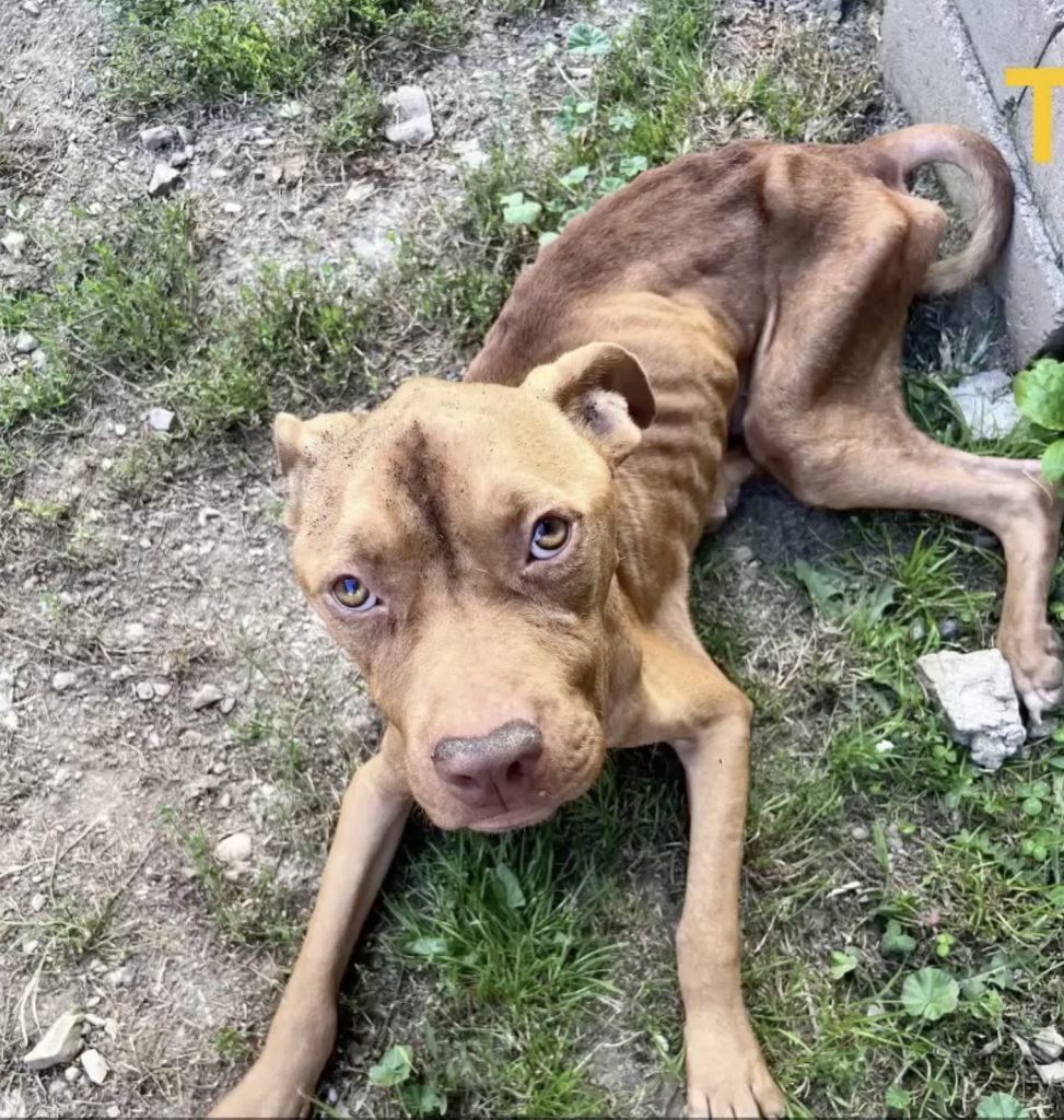 When rescuers first laid eyes on Justice, their hearts broke at the sight before them. He had been discovered on a neglected property during an eviction — nothing but skin and bones, tied up and left behind like a forgotten object. His frail body spoke of years of suffering. At just thirty-five pounds, he was barely half the weight a healthy dog of his size should have been. His ribs pressed tightly against his skin, his eyes were sunken with exhaustion, and every step he took seemed like a battle between life and collapse. Yet, even in that desperate state, there was still a spark — a faint, stubborn will to survive that had somehow refused to die out.