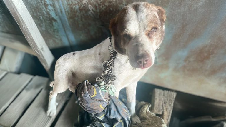 Shanya’s body told the story of her suffering. Her ribs were visible beneath her thin, matted fur, and her eyes—once bright and curious—had gone cloudy and lifeless. The chain around her neck wasn’t even a proper collar; it was a crude and painful contraption made of layers of old canvas bound with steel wire. Over time, it had become part of her body, cutting into her skin and leaving deep marks that would take months to heal. She had been left in this heartbreaking condition for so long that she had gone blind, and her body was slowly giving up.