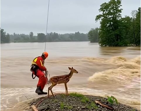 The rescuer, with a harness strapped securely, moved with purpose but also with incredible gentleness. Kneeling in the shallow water, they carefully approached the frightened fawn, a beacon of calm amidst the chaos.