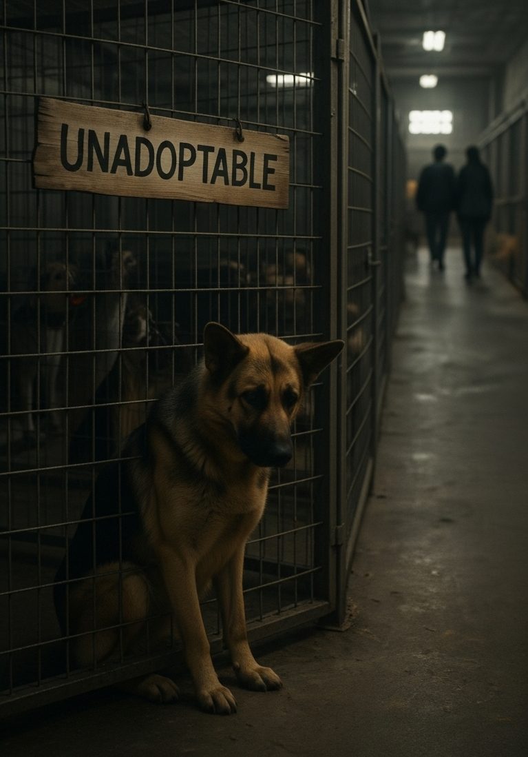 The shelter was noisy that day. Barks echoed off cement walls, tails thumped eagerly, eyes tracked every passerby. In the back, in a silent corner, sat a German Shepherd who didn’t lift his head. He didn’t bark or move — only stared at the floor, as if he’d already given up. His tag was gone, replaced by a weathered sign that read Unadoptable.