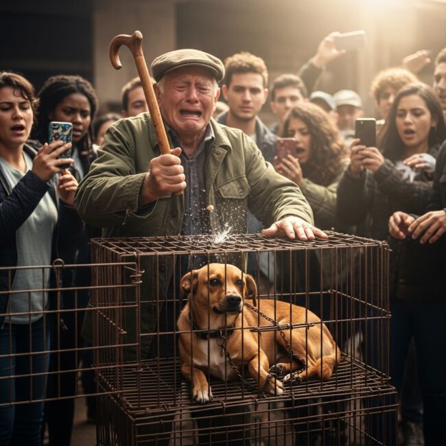 The morning market froze as an elderly man with a trembling hand raised his cane and struck the metal dog cage again and again. People shouted, thinking he was cruel. But the look in his eyes—fear, pain, desperation—told another story.
