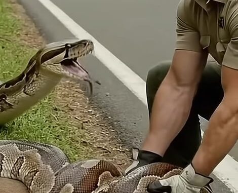With calm precision, the ranger radioed for assistance, requesting specialized wildlife support. He then retrieved a humane wildlife tool from his vehicle — not to harm the snake, but to create a safe distance. The python lifted its head defensively, not out of hostility, but out of instinct. Its tongue flicked the air rapidly, sensing change. The ranger remained still, speaking calmly in a steady tone, allowing the animal to understand there was no threat. His goal was not to force separation but to gently encourage it.