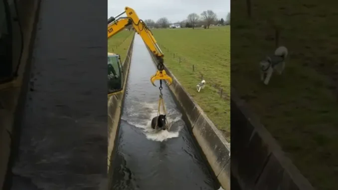 With straps secured, the excavator operator began the delicate process. The machine’s arm carefully lifted the horse, water cascading from its body as it was slowly raised from the canal. The dog watched with bated breath, never taking its eyes off the scene for a second.