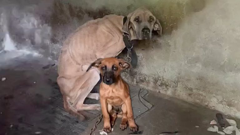 In a quiet and forgotten corner of an abandoned property, rescuers came upon a scene that would break even the hardest of hearts — a mother dog and her puppy left chained and starving, surrounded by silence and loss. The mother, later named Arizona, was so emaciated and frail that she could barely lift her head. Her ribs pressed sharply against her skin, and every breath seemed to take everything she had left. Beside her was her loyal puppy, Texas, whose tiny body trembled from weakness but whose spirit refused to give up. Even in his own fragile state, the little one stayed close, nudging his mother, crying softly, as if trying to wake her up and tell her everything would somehow be all right.