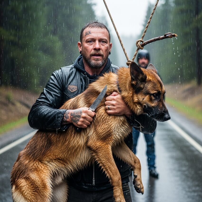 He’d pulled over on a lonely forest road outside Montana when his headlights caught something swinging beneath a tree. It wasn’t a branch—it was a dog, a brown German Shepherd, tied by the neck, legs trembling, gasping for air.