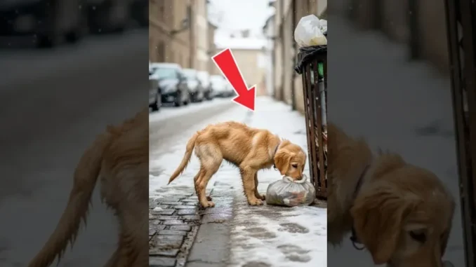 On a cold, snowy day, a tiny golden retriever puppy was spotted on the deserted street, its fur matted and damp with melted snow. Its small frame shivered visibly as it nosed around a garbage bag, desperately searching for a scrap of food.