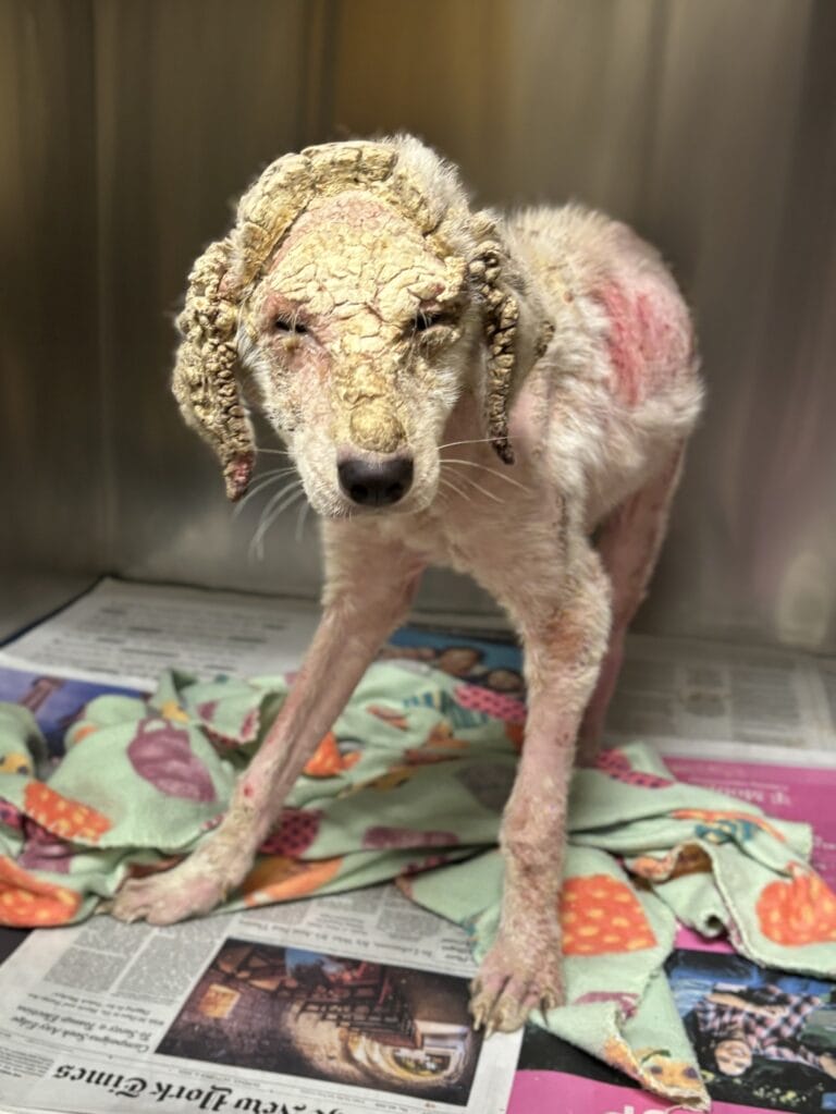 The dog was reportedly found hiding, and was in terrible shape: she had completely matted fur, a severe buildup of dried, dead skin, and the poor dog had scratched herself so much that her skin was pink and bleeding.