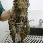 The dog was reportedly found hiding, and was in terrible shape: she had completely matted fur, a severe buildup of dried, dead skin, and the poor dog had scratched herself so much that her skin was pink and bleeding.
