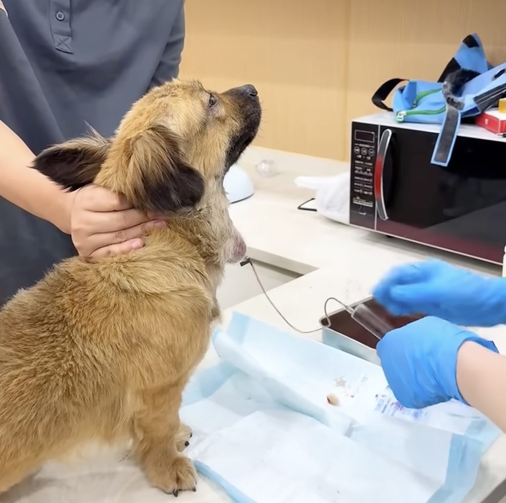 At the clinic, the staff moved quickly. The vet examined the dog carefully, running her hands along the swollen area while murmuring comforting words. The X-rays confirmed that it was indeed a large mass. At that moment, everyone in the room held their breath. They didn’t yet know if the growth was cancerous or not. But one bit of good news came almost immediately: the blood test results were normal. The vet explained that the lump was a buildup of lymphatic fluid, not a malignant tumor — something that, with treatment, could be relieved.