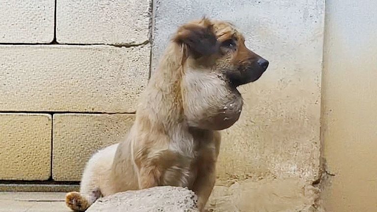 When the kind stranger first laid eyes on the dog, their heart broke. The poor pup was in terrible shape — a large, heavy growth hung from his chin, weighing at least two pounds. His fur was thin and patchy, crawling with lice and ticks. His eyes were filled with quiet fear and sadness, the kind that comes from too many days of suffering alone. Every movement he made was slow and uncertain, as if he wasn’t sure whether to trust the kindness being offered. Yet beneath the grime and pain, there was still a spark — a tiny glimmer of hope that refused to die.