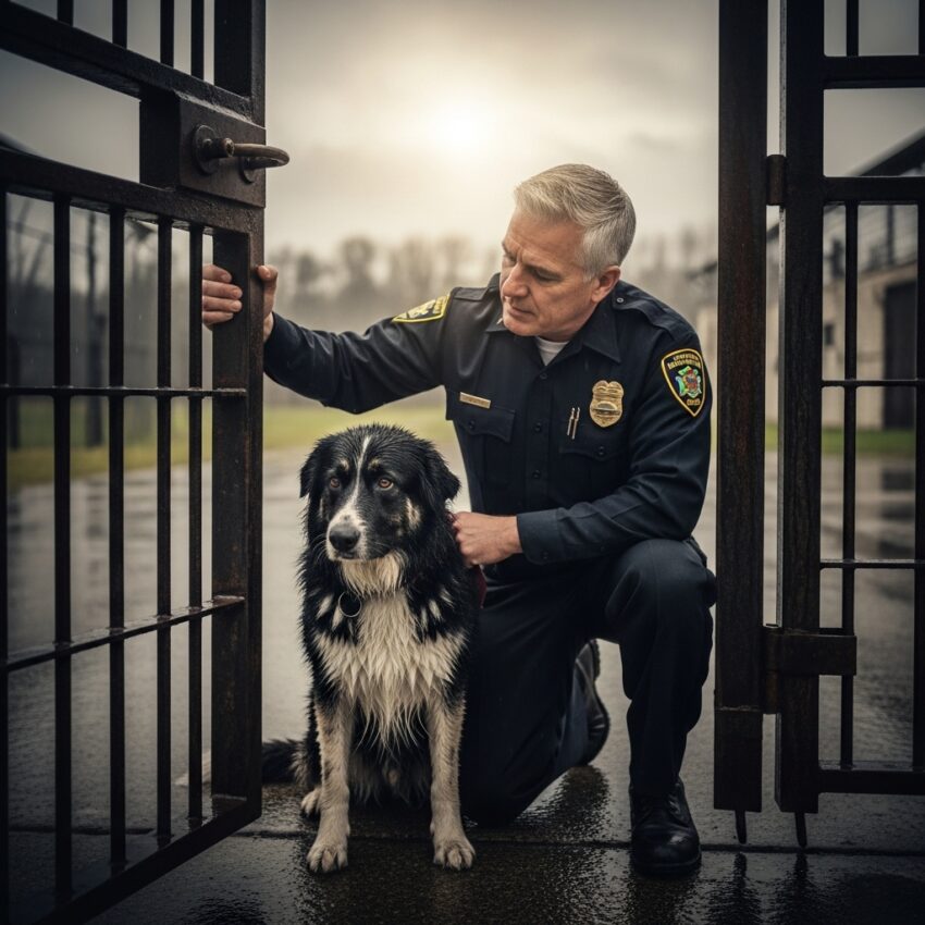 At the edge of the prison gate sat a black-and-white shepherd, thin, trembling, soaked to the bone.