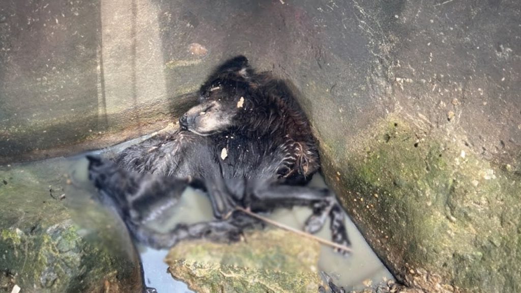 Down in that cold, dark place lay a dog who had nearly given up. His name would later be Bruno. His body told a silent story of pain and neglect—he was thin to the bone, his fur matted and crawling with ticks, and ropes were cruelly tied around him. His head bore the marks of a heavy blow, the kind that could have ended his life. Yet somehow, Bruno was still breathing, still holding on to a fragile thread of hope.