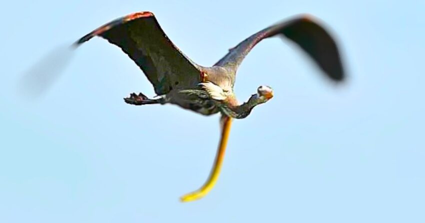 But suddenly the eel burst from the bird’s throat and dangled beneath the heron while in the air.