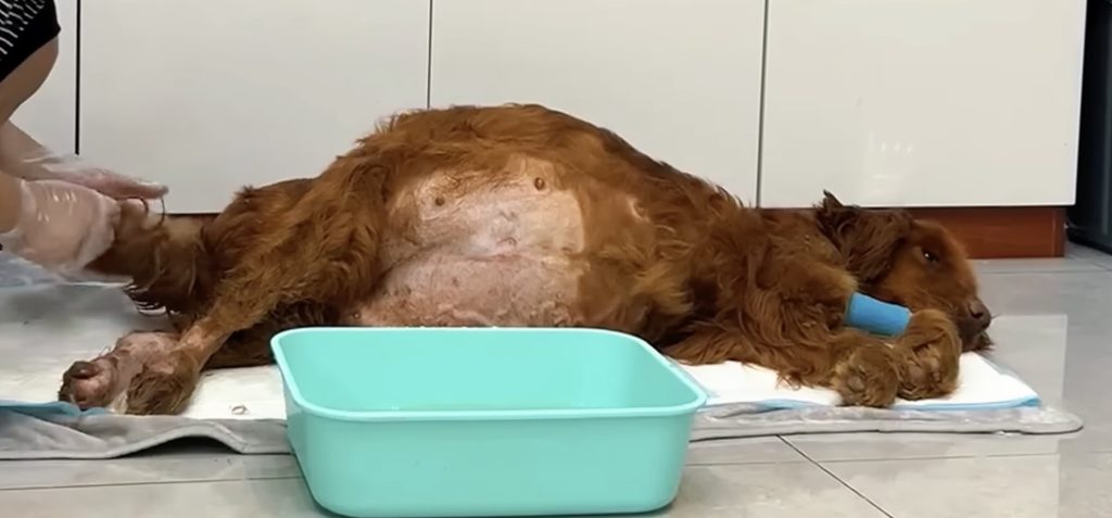 When they arrived at the veterinary hospital, the reality of her condition became painfully clear. Jinni was too weak to walk and had to be carried inside on a soft blanket. The vet, a woman who had treated hundreds of animals over the years, froze for a moment when she saw her. Jinni’s belly was grotesquely distended, her legs swollen and stiff. Initial tests revealed severe ascites — fluid filling her abdomen — and serious edema in her limbs. Her albumin levels, which measure vital protein in the blood, were only sixteen. A healthy dog should have at least twenty-four.