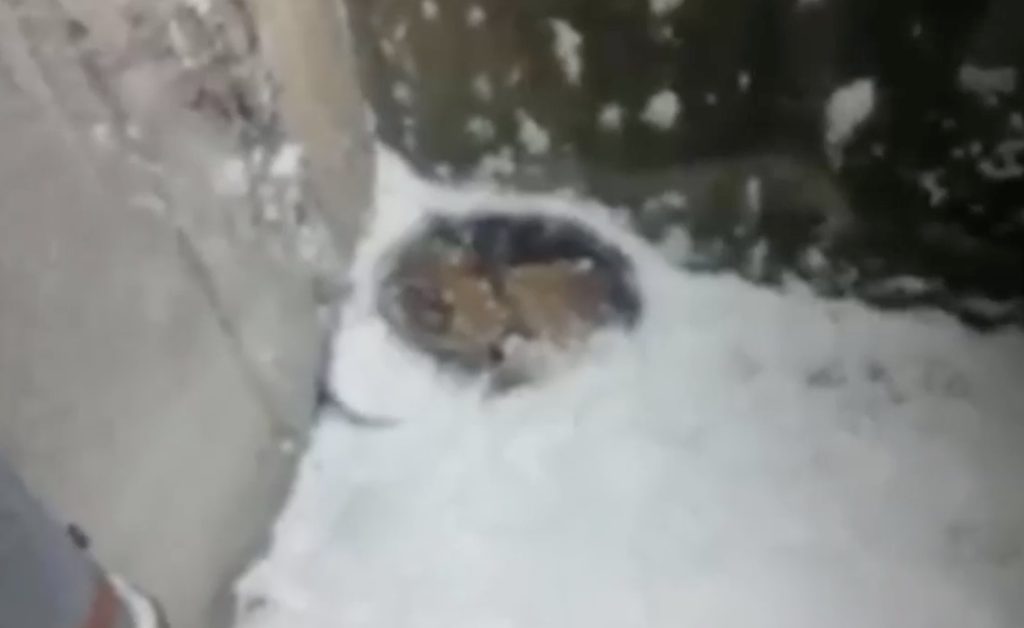 When her rescuer finally found her, she could barely move. She was lying so still that for a moment it seemed life had already slipped away. Her small body was blanketed with snow, and in her desperation she had been licking at it, perhaps trying to ease her thirst or cling to the only thing around her. Her eyes, glassy and distant, told a silent story of exhaustion and fear. The rescuer’s heart sank — she looked too weak to survive. But when he gently reached out, her tiny frame flinched, and she tried to hide her head against the wall. That faint movement was enough to show there was still a spark of life left in her.