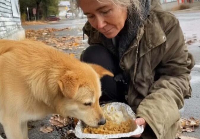 I followed her outside. That’s when I saw the truth. Behind the building, sitting patiently in the cold, was a dog — thin, trembling, and waiting. Rachel knelt beside him, setting down the meal with both hands as if it were the most precious thing in the world.
