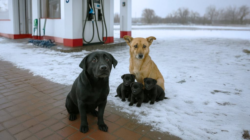 In a place ruled by noise and steel, where heavy trucks thundered across endless roads, a mother dog named Busya brought four tiny lives into a cold and uncertain world. The winter wind howled across the open land, cutting through the air like glass. The ground was frozen and hard beneath her fragile frame. She had no shelter but the rusted remains of an old gas station, and no comfort except for the gentle warmth of her mate, a strong and faithful dog who never left her side. Together, they watched over their newborns—small bundles of fur that whimpered softly in the biting cold, unaware of how close danger lived.
