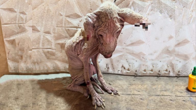 When I first saw her, standing quietly in the corner of our small rescue lodge, my heart broke in ways I can hardly describe. She looked like a fragile memory of what a dog should be—a faint outline of life itself. Her ribs pressed against her skin as if crying out from within, and her fur had nearly vanished, leaving behind patches of tenderness and pain. Her skin told a story of long suffering, of countless days without comfort or light. Even her legs, bent and frail, bore the marks of a life spent without the strength-giving warmth of the sun. You could tell she had been denied everything a living creature needs—light, touch, kindness. She had known only darkness for too long, hidden away in a damp, lonely place beneath the earth.