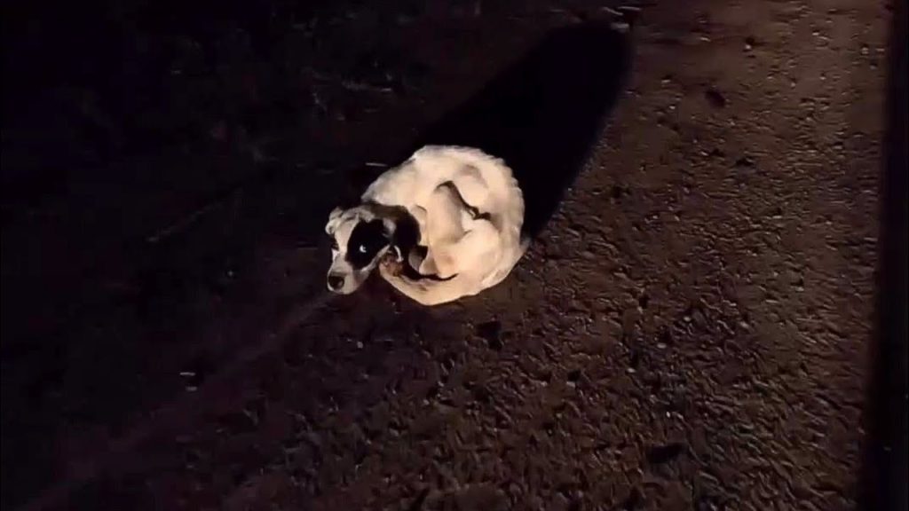 Late one chilly night, a man heading out on a camping trip found himself slamming on the brakes as his headlights landed on something small in the middle of a quiet dirt road. At first, he thought it might just be a bundle of leaves or debris blown across the path. But when he stepped out of the car and approached carefully, he realized it was actually a tiny dog—white and black, curled tightly into a trembling little ball. The air was cold enough to sting, somewhere around fifty-six degrees, and the sight of that fragile little body shaking gently in the road stopped him in his tracks. The dog looked thin, frightened, and exhausted, as if he had been out there far longer than anyone could imagine.