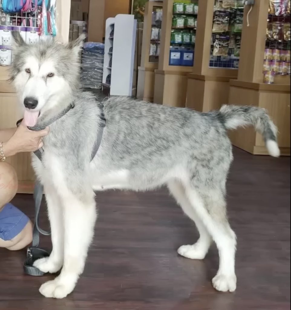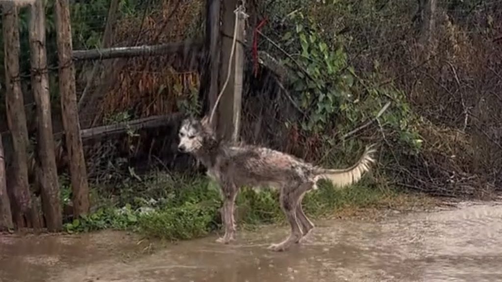 Esther’s story begins on a stormy day, in a quiet and hidden alley where almost no one ever walked. The rain was pouring relentlessly, and the wind echoed through the narrow passageways. In that lonely corner, a gentle Husky mix lay tied up and abandoned, his spirit nearly slipping away. He was so frightened that his soft cries blended into the sound of the storm, as if he had been hoping someone—anyone—would hear him. His body told a heartbreaking story: ribs sharply visible, frame weakened, coat dirty and heavily matted, and his skin irritated by parasites. Even in the dim light, it was clear he had endured immense hardship.