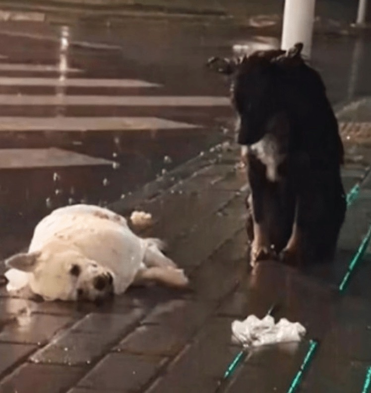 Relentless rain hammered the streets, turning bright city lights into soft, trembling halos that drifted through the storm. On a lonely stretch of sidewalk, beneath the stark glow of an aging streetlamp, a scene unfolded that would quietly touch the hearts of thousands. A white dog lay motionless on the cold pavement, its fur soaked through with rain and something heavier, as if the night itself had pressed sorrow into its fragile body. Beside it sat a black dog, still and solemn, holding a silent vigil with a depth of loyalty that felt almost human.