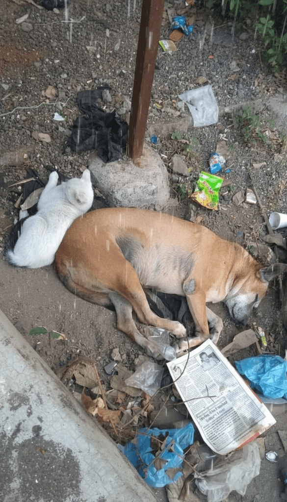 The rain was a relentless drumbeat on the asphalt, each drop a tiny, cold spear. It had been like this for hours, a dreary, persistent assault on the already sodden streets of the city’s forgotten corners. Beneath a rusted lamppost, its light long since extinguished, a scene unfolded that most would simply pass by, if they even noticed it at all. A dog, a creature of indeterminate breed, its fur a matted tapestry of dirt and the elements, lay curled on the damp earth. Its body, thin and weary, bore the silent marks of a life lived on the fringes – scars, patches of missing fur, and an air of profound exhaustion. Yet, nestled against its side, a stark contrast of pristine white, lay a cat.