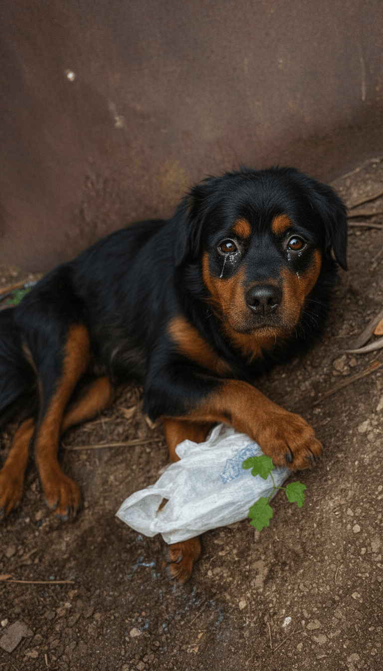 In the shadow of a rusted dumpster on the outskirts of Bucharest, Romania, where the bitter winter wind howled through abandoned industrial lots, rescuers from the local animal welfare group Paws of Hope stumbled upon a sight that would haunt them for weeks. It was late November 2023, and the temperature had dipped to a bone-chilling -5°C (23°F). There, curled up on a bed of frozen mud and discarded plastic bags, lay a young Rottweiler mix no older than eight months. Her black-and-tan coat, matted with grime and fleas, clung to her emaciated frame. She wasn’t whimpering or struggling—just lying there, her large brown eyes glistening with what looked like tears, fixed on the rescuers with a quiet, disbelieving stare. Beside her paw was a torn white plastic bag, its contents spilled out: a few moldy bread crusts and a half-eaten apple core, the only evidence of her desperate scavenging. This was Susanna, a dog who had been discarded like yesterday’s trash, her survival hanging by the thinnest thread.