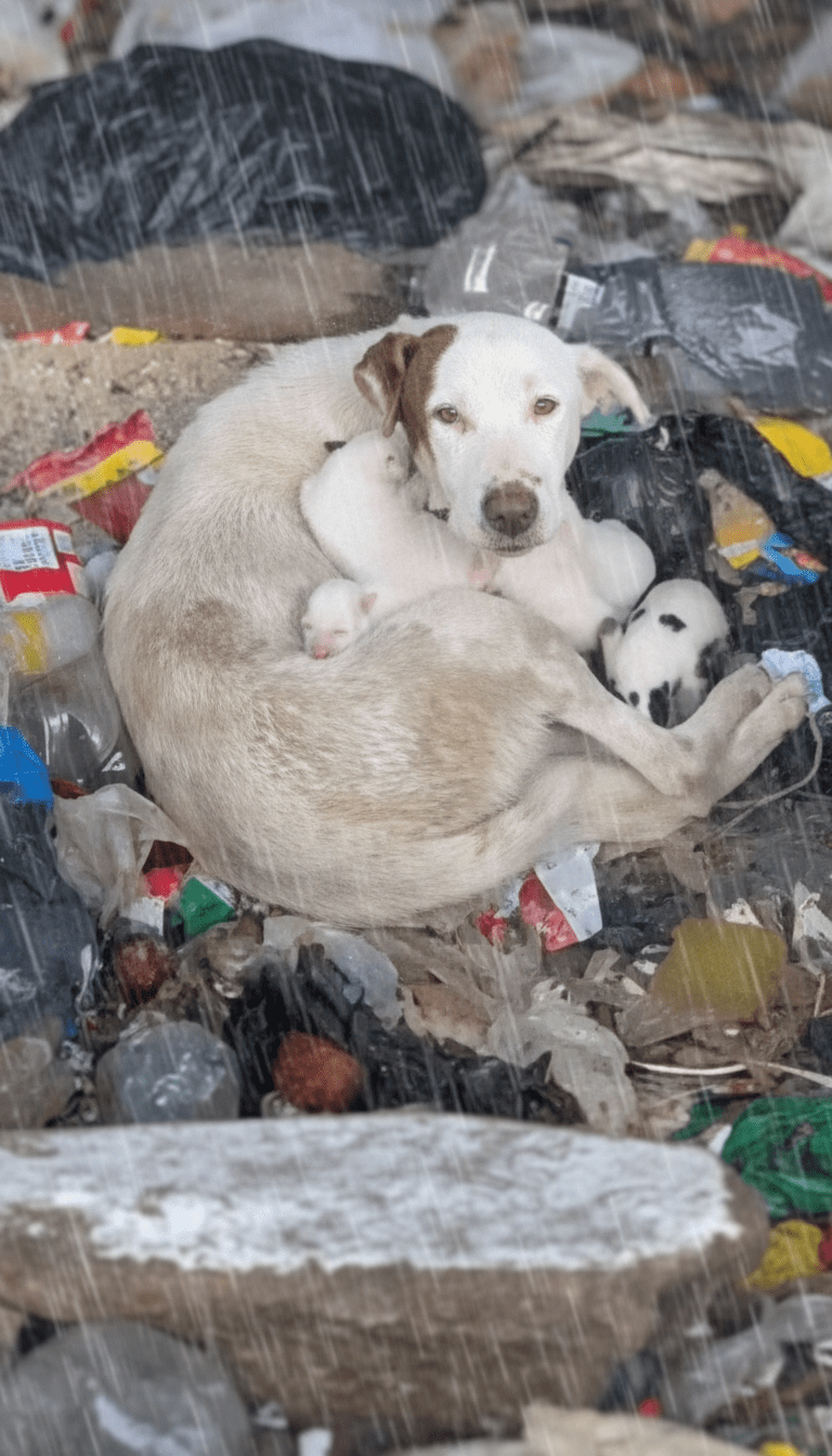 In the quiet suburb of Springfield, Ohio, on a bitterly cold November morning in 2023, 28-year-old veterinary technician Sarah Mitchell was taking out the trash behind the animal clinic where she worked. As she lifted the heavy lid of the commercial dumpster, a faint whimper stopped her cold. Peering into the mountain of crumpled bags, discarded medical supplies, and coffee cups, she saw something that made her stomach drop: a small white dog, no larger than a beagle, curled protectively around five newborn puppies. The mother’s brown ears were frost-tipped, her ribs visible beneath matted fur, yet she had formed a perfect circle with her body to shield her hours-old babies from the 28-degree chill. Empty soda bottles and shredded pizza boxes pressed against their tiny forms. The puppies—still wet from birth, eyes sealed shut—were miraculously alive, their miniature paws kneading their mother’s belly in search of milk she barely had strength to provide. Sarah would later say the mother dog locked eyes with her, not barking, not growling, just staring with a mixture of exhaustion and desperate hope. In that instant, Sarah knew this was no accidental litter; someone had deliberately sealed a cardboard box, taped it shut, and tossed an entire family into the trash like yesterday’s leftovers.