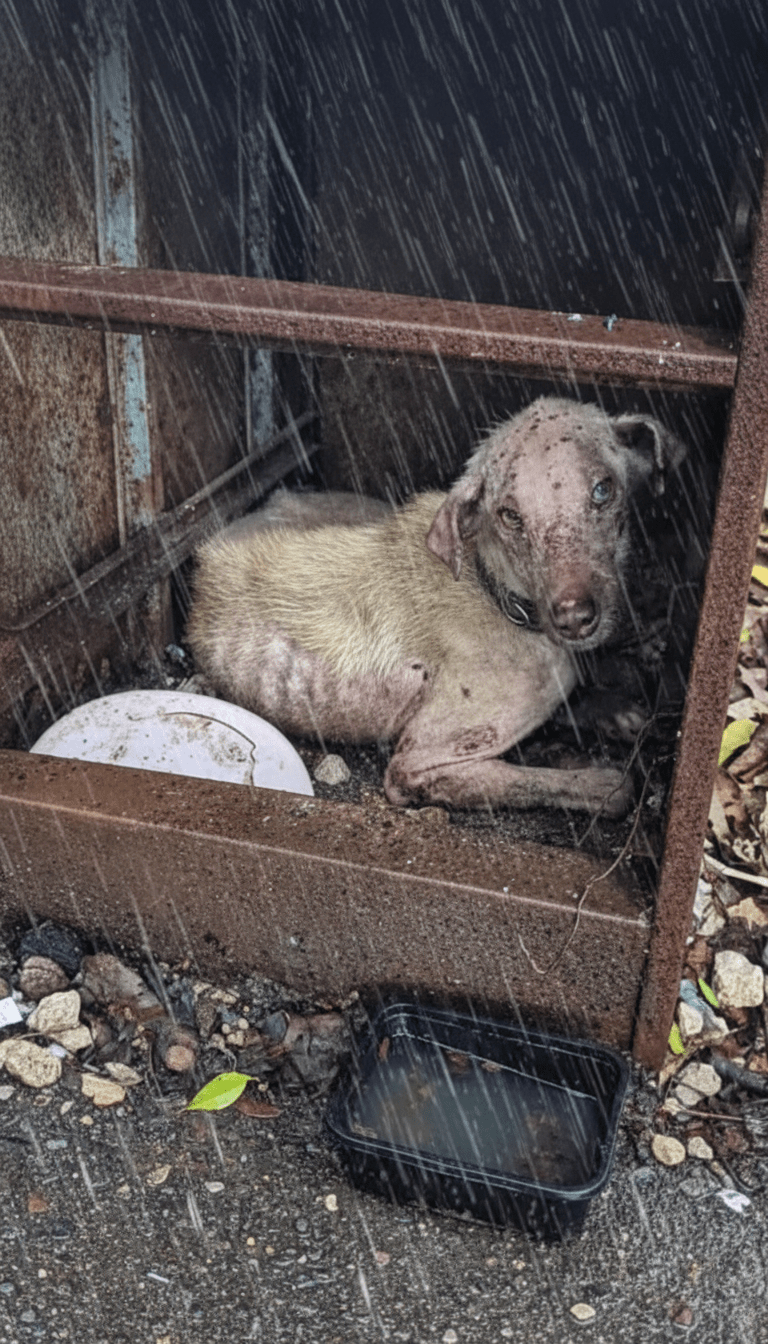 In the sweltering heat of a late summer afternoon in rural Kerala, India, on August 15, 2024, a frail dog sat motionless beside a rusted metal post on the shoulder of National Highway 66. Her light tan coat, patchy and marred by bald spots from untreated mange, clung to her emaciated frame like a worn-out blanket. A frayed rope, knotted tightly around her neck and secured to the post with a crude loop, restricted her to a tiny circle of dirt littered with fallen mango leaves and plastic debris. An empty plastic plate lay overturned nearby, beside a shallow black tray that once held water but now baked dry under the relentless sun. Vehicles roared past—trucks laden with coconuts, motorcycles weaving through traffic, and colorful buses heading to Kochi—yet not a single driver slowed down. Passersby on foot, locals carrying baskets of fish from the nearby market, glanced her way but hurried on, their faces etched with the indifference born of seeing too many strays. She didn’t bark or whimper; she simply waited, her large green eyes fixed on the horizon, as if expecting the familiar footsteps of someone who would never return. This was Dottie, abandoned just hours earlier by a family who could no longer afford her veterinary care amid rising inflation, left with the faint hope that “someone else would take her.” That quiet vigil, captured in a grainy smartphone photo by a compassionate truck driver named Rajesh Kumar, would ignite a chain of events no one could have predicted, transforming her from an invisible casualty of poverty into a symbol of resilience that captivated a nation.