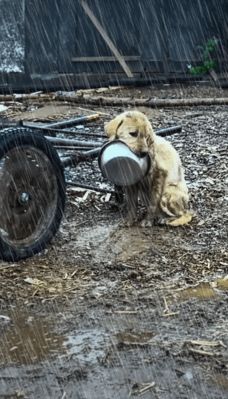 In the dusty outskirts of a small village near Jaipur, India, where the relentless summer sun scorches the earth into cracked mosaics and the air hums with the distant calls of peacocks, a heart-wrenching scene unfolded on July 15, 2024, that would capture the attention of millions worldwide. A frail golden Labrador puppy, no more than three months old, sat trembling beside a rusted bullock cart, its tiny paws gripping an oversized metal bowl as if it were the last tether to hope. The image, blurry yet profoundly moving, showed the pup’s wide, soulful eyes brimming with unspoken pleas, its matted fur caked with mud from recent monsoon rains. The bowl—empty, dented, and far too large for its diminutive frame—hung precariously from its mouth, a symbol of futile desperation. Behind it, the remnants of a dilapidated shack leaned precariously against a crumbling wall, with scattered firewood and a lone green parrot perched indifferently on a fence post. This was no staged photograph but a raw snapshot of survival, taken by a passing street vendor who couldn’t bear to look away. What began as a quiet cry for food in rural Rajasthan spiraled into an international saga of neglect, unexpected heroism, and a twist of fate that restored faith in humanity.