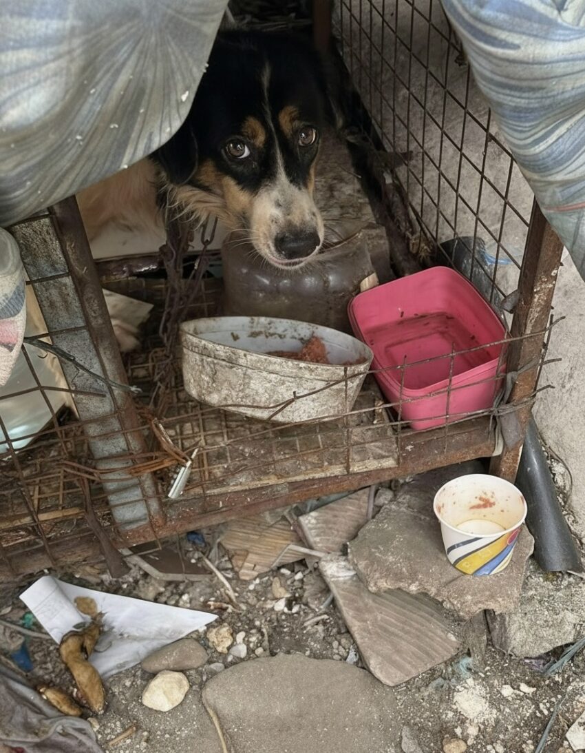 In the sweltering heat of a forgotten corner of northeastern Thailand, where the Mekong River’s muddy banks dissolve into sprawling rice paddies, a single photograph captured a scene that would unravel a web of cruelty hidden for over a year. It was July 15, 2024, when 28-year-old rice farmer Somchai Niyom wandered off the dirt path near his village of Ban Phon Pheng, lured by the faint, plaintive whimpers echoing from a cluster of overgrown banana trees. What he stumbled upon was not just a malnourished dog peering through the rusted bars of a makeshift cage, but a chilling testament to human indifference: a German Shepherd mix, its black-and-tan coat matted with filth, eyes wide with a mix of fear and flickering hope, trapped in a prison of corroded wire and debris. The cage, barely large enough for the dog to turn around in, was shrouded under a tattered blue tarp that fluttered like a mocking flag of neglect. Bowls inside—one white and cracked, filled with what looked like days-old, congealed red slop, and a pink plastic tray bone-dry without a drop of water—sat amid scattered rocks, crumpled papers, and the skeletal remains of a chicken foot, as if the universe itself had conspired to underscore the abandonment. Somchai’s smartphone snapshot, taken at 3:47 PM under a relentless sun, would soon ignite a firestorm of outrage across Thailand and beyond, exposing not just one dog’s plight but a clandestine operation that had ensnared dozens more.