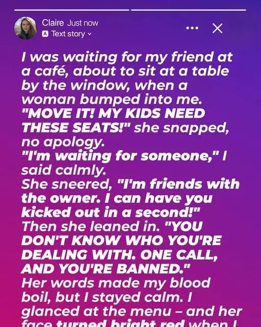 Move it! My kids need these seats.” She didn’t pause or apologize. I took a breath and replied calmly, “I’m waiting for someone.” Her expression tightened as she said, “I’m friends with the owner.