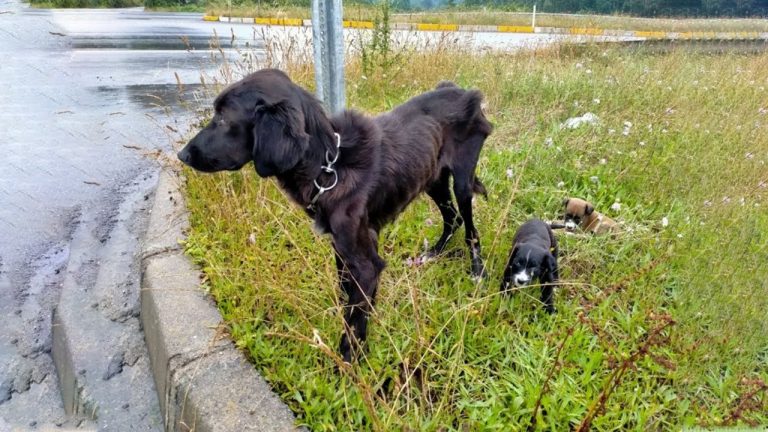 It was a rainy day when a heartbreaking scene unfolded on the side of a quiet road — a devoted mother dog, thin and trembling, was found tied to a metal pole, her two tiny puppies huddled beside her. Soaked to the bone, she stood guard despite her weakening body, while her puppies whimpered from hunger and cold. They didn’t understand why they were there, or why the one they trusted most could barely move anymore.