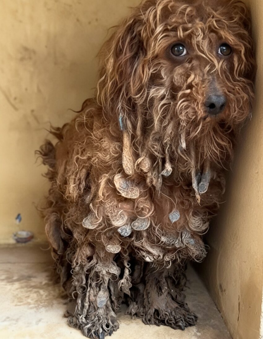 In the relentless downpour of a late autumn evening in rural Kerala, India, on October 12, 2024, a group of rice farmers wrapping up their day’s labor in the flooded paddies of Alappuzha district stumbled upon a sight that would forever alter their understanding of resilience. The sky had unleashed a monsoon fury, turning the earth into a quagmire of red clay and standing water, when one farmer, 52-year-old Rajan Pillai, heard a faint, whimpering cry cutting through the roar of the rain. Shielding his eyes from the sheets of water, he spotted her: a small, curly-haired dog huddled against the splintered remains of an old coconut palm fence, her body half-submerged in muck. Her fur, once likely a rich chestnut brown, was matted into heavy, dripping clumps embedded with thorns, cow dung, and fragments of broken pottery from a nearby discarded waste pile. Her eyes—large, dark, and brimming with exhaustion—locked onto Rajan’s with an intensity that pierced the storm, a silent plea that no one could ignore. What the farmers didn’t know then was that this trembling creature, whom they would name Lucky, was not just fighting for her own survival but carrying a hidden miracle just days from unfolding.
