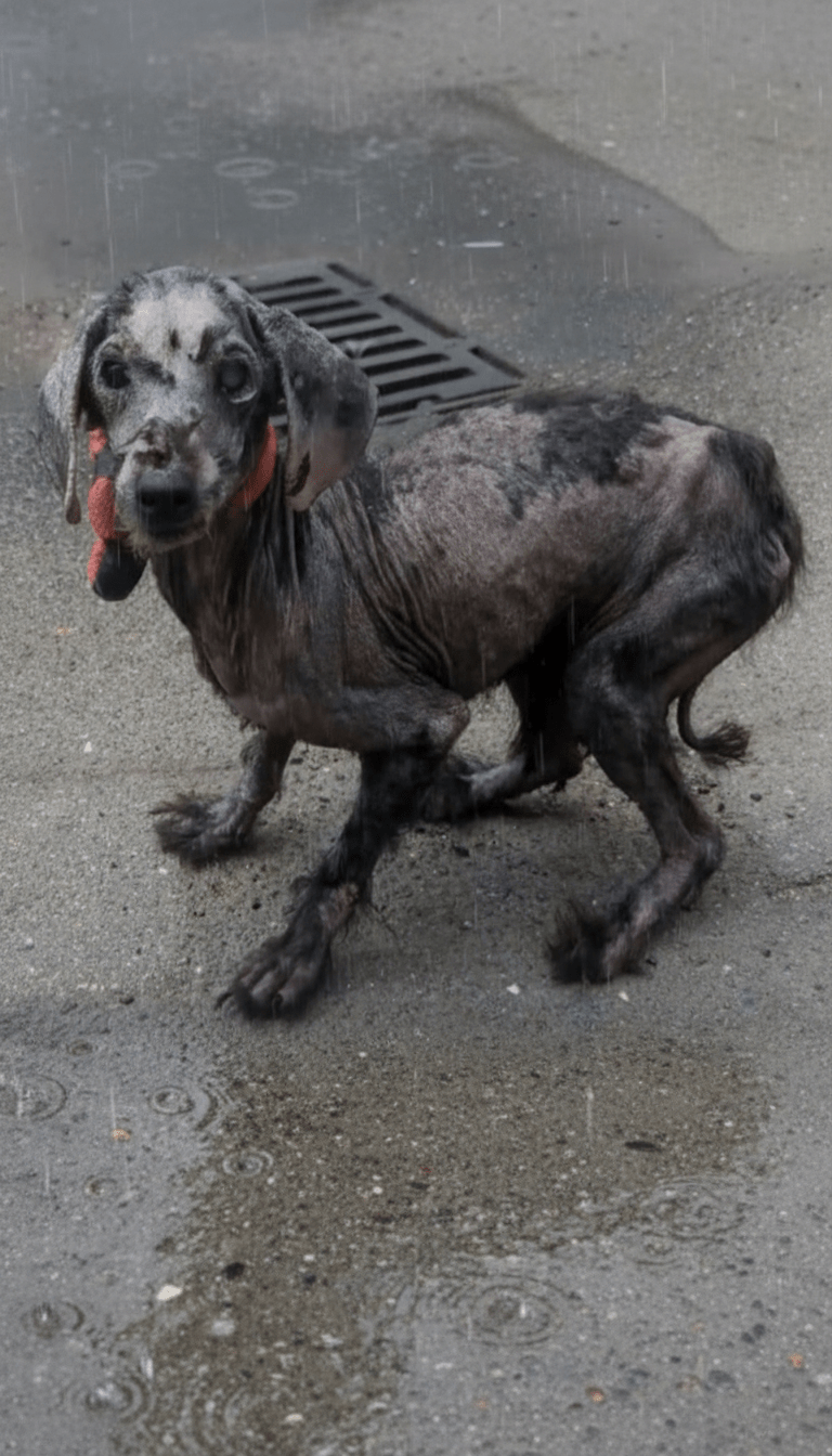 On a cold, relentless November afternoon in 2022, a tiny, hairless creature shuffled through the pouring rain on a quiet street in Swansea, Wales. To passers-by, the animal looked more like a mythical gargoyle than a dog: skin stretched tightly over protruding bones, open sores weeping in the downpour, and a faded red collar hanging loosely around its neck as the only proof it had once belonged to someone. The skeletal dachshund-cross, later named William, weighed barely 2.8 kg and was so weak that every step seemed to be his last. Minutes later, a second, equally emaciated figure emerged from the same alley — a slightly smaller female with the same raw, pink skin and hollow eyes. She was given the name Poppy.