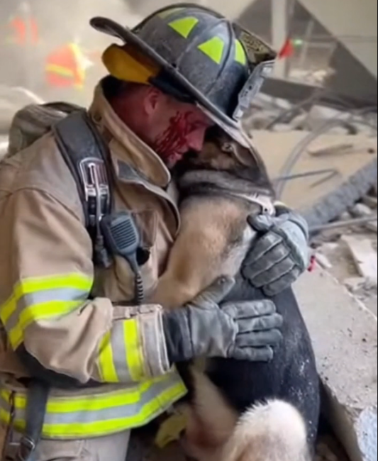 The words trembled out of a man coated in ash, his voice cracking, his arms wrapped around a K9 dog who wasn’t responding.