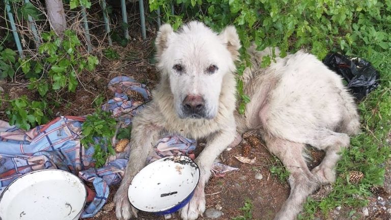 On a scorching summer day, a dog named Arhat was found lying helplessly by a fence, too weak to move. His body told the story of weeks of suffering. For three long weeks, his owner had abandoned him, leaving him with only the occasional scrap of food. By the time help finally arrived, he was starving, dehydrated, and so exhausted that he could no longer stand. His thin body was crawling with ticks, and his spirit seemed to flicker on the edge of giving up. When a rescuer finally approached and placed a bowl of food and water in front of him, the moment was unforgettable. Arhat, overcome with emotion, let tears roll down his face, as if he could finally feel a glimmer of kindness after so much neglect.
