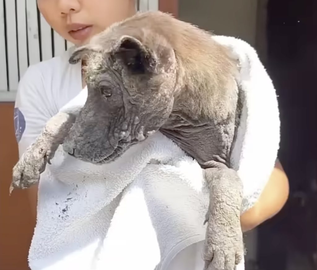 This small, defenseless dog had been locked away for months by the very person who was supposed to care for him. With no access to fresh air, light, or even the most basic affection, he had withered into a ghost of a puppy. His tiny body was riddled with mange and infection, his skin raw and exposed from the loss of nearly all his fur. Every bone beneath his skin could be seen. His body told the story of starvation, but his eyes revealed something deeper—a kind of quiet suffering, a fear of the world outside, and perhaps the fading hope that someone would care enough to save him.