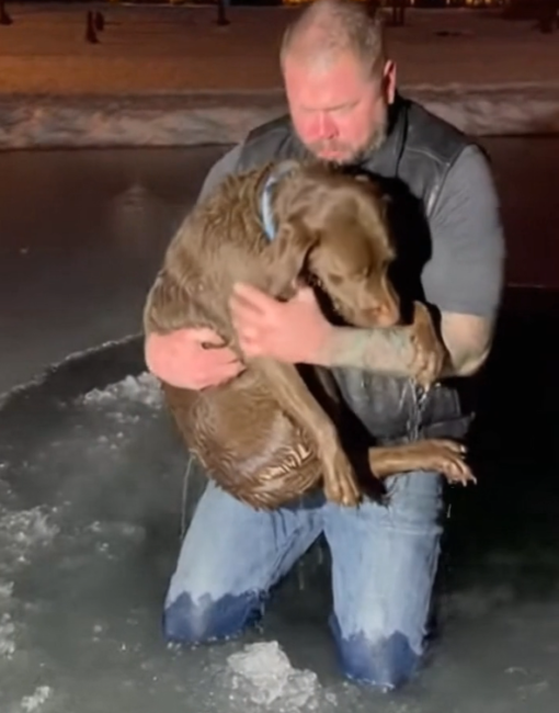 He pushed the dog upward — lifting Murphy onto the ice first.