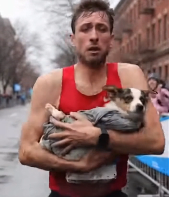 The puppy tucked against his chest, wrapped in his own running jacket.