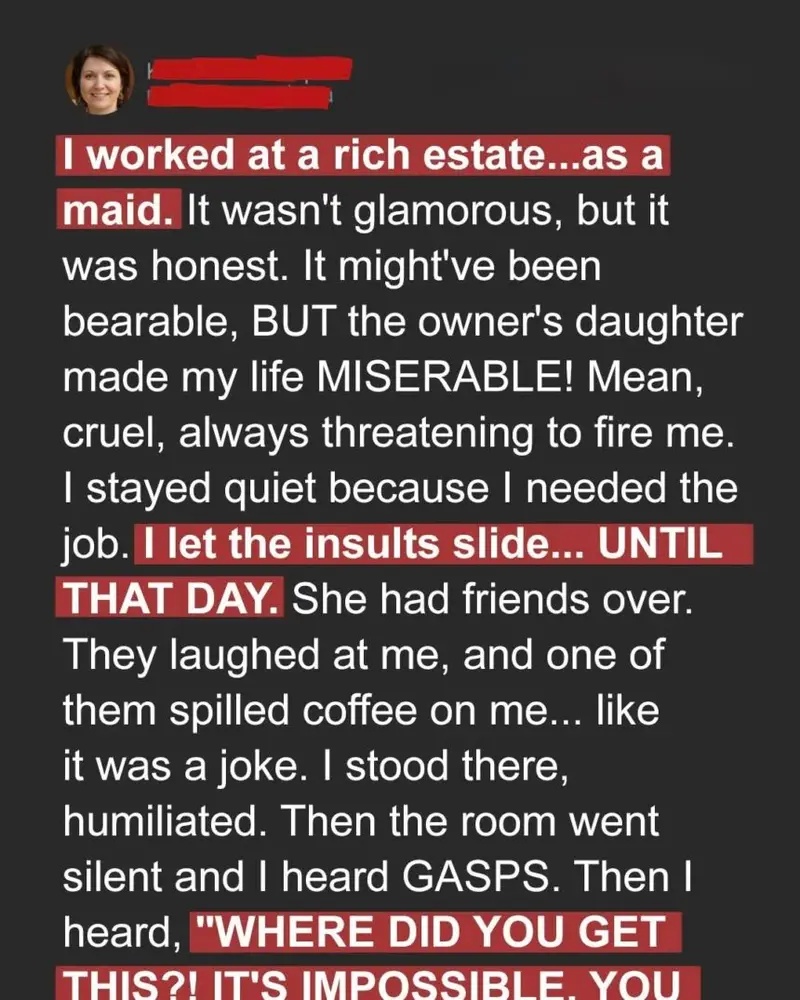 Tris, on the other hand, was rude and dismissive. One night, during a gathering, Tris and her friends mocked me openly, calling maids “trash” and accusing me of stealing. When Tris spilled hot coffee on me and dismissed my pain, I finally snapped.