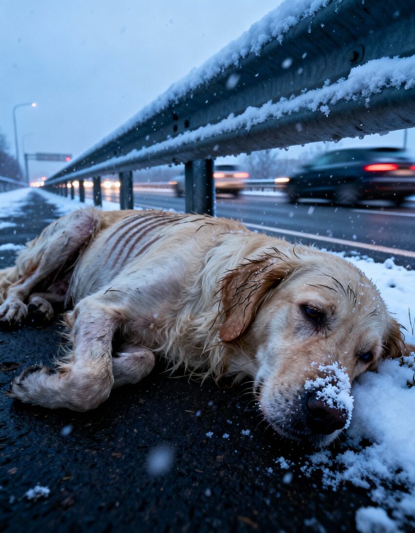 For three agonizing hours, the Andersons searched, their calls for Bailey lost in the howling wind. Heartbroken and with the storm worsening, they were forced to get back on the road, leaving their contact information with the local police and a nearby gas station. Meanwhile, Bailey, confused and frightened, had wandered far from the rest stop. He ended up by the side of Interstate 80, his golden fur matted with snow, his body shivering violently. He lay down on the frozen asphalt, a small, defeated figure against the roar of passing trucks, his eyes scanning every vehicle in a desperate hope of seeing his family.